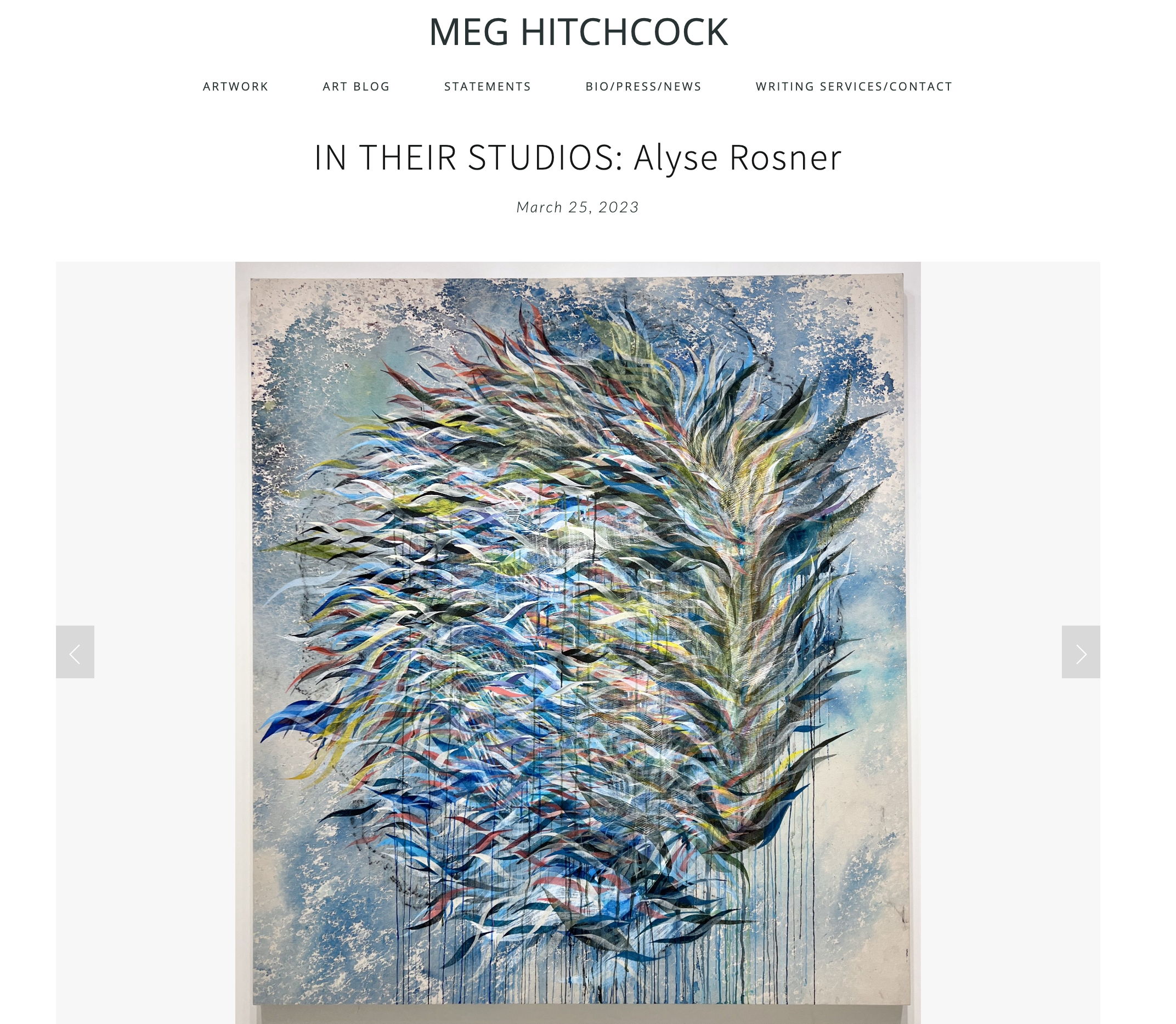 I have been very lucky during quarantine. My studio is a walk- out basement in my home, so I have had access to it throughout the pandemic. Last winter I applied for a residency through the Clementina Arts Foundation and I was notified in March of 2020 that I was awarded a studio for 6 months in unused retail space in the Stamford Town Center mall… Currently I have four mural scale paintings underway, a layered installation of frottage scrolls on yupo and sheer fabric panels that is part of my collaborative project Object, Surface, Texture, and a handful of other odds and ends.