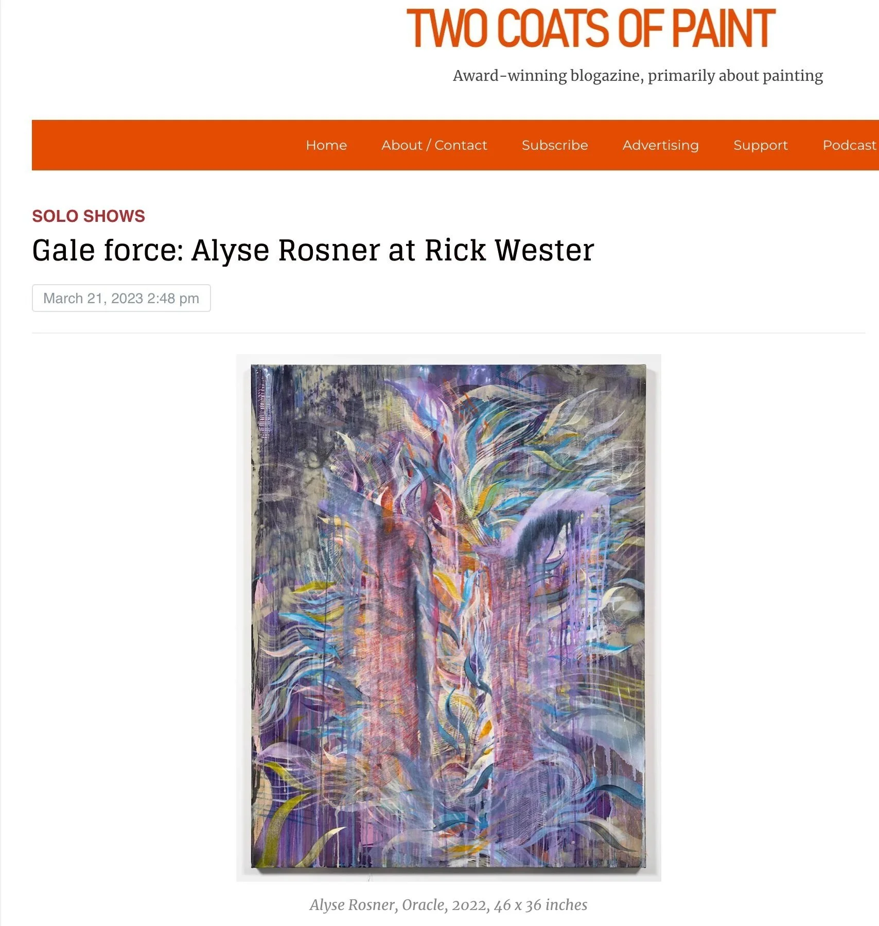 “Bracing Against the Wind,” the title of Alyse Rosner’s solo exhibition at Rick Wester Fine Art, can be read literally and poetically. While her paintings depict dynamic elements of nature, they also reveal the intuitive hand of the artist.