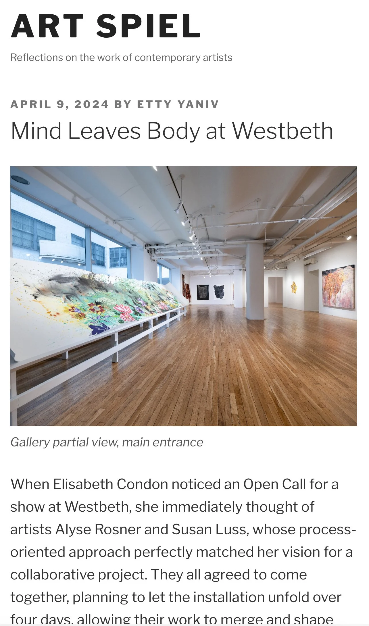 When Elisabeth Condon noticed an Open Call for a show at Westbeth, she immediately thought of artists Alyse Rosner and Susan Luss, whose process-oriented approach perfectly matched her vision for a collaborative project. They all agreed to come together, planning to let the installation unfold over four days, allowing their work to merge and shape the exhibition dynamics. Their setup process—discussing, reshaping, and improvising in the gallery—revealed more profound interconnections. The trio’s improvisational method produced an exciting viewing experience analogous to a live jazz ensemble with distinct leitmotifs.